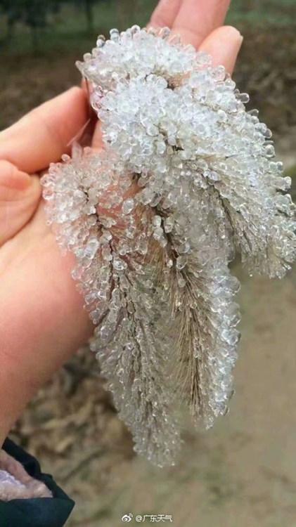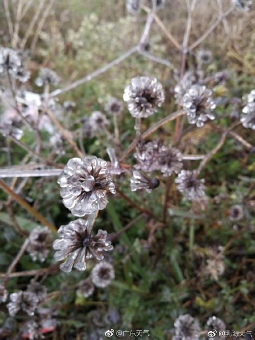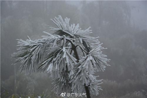 2018年最后一波寒潮,给粤北山区带来了降雪天气,也出现了雨凇、雾凇等现象。成因:低于0℃的雨滴在温度略低于0℃的空气中能够保持过冷状态(即超冷却降水),当它落到温度低于0℃的物体表面时,立刻冻结成外表光滑而透明的冰层,称为雨凇。