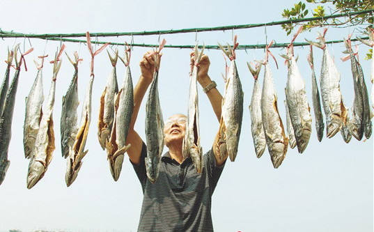 岁末寒冬是晒制海鲜干货的好时节,城区马宫街道的渔民在天气晴好的时候,抓紧时机将捕获的马鲛鱼、乌枪鱼等海产品晾晒成鱼干投放市场。