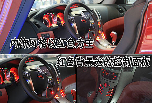 作为一款高端跑车,吉利GT的内饰也绝不含糊,内部大部分都采用了红黑双色的运动风格设计,不过感觉方向盘的尺寸有些偏大。中央控制台都采用了银色装饰材料,并且配备了DVD系统及导航系统。座椅同样采用红黑双色的运动风格座椅,突出了这款跑车的运动特性。