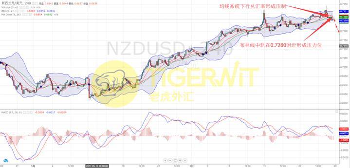 纽元兑美元:纽美汇率于高位连续遇阻后开启回调走势,均线系统掉头向下,布林线中轨对汇率形成压制,下行风险不断加大,建议逢高做空。操作面:0.7275-0.7295区间逢高做空,止损位0.7310,止盈位0.7240。