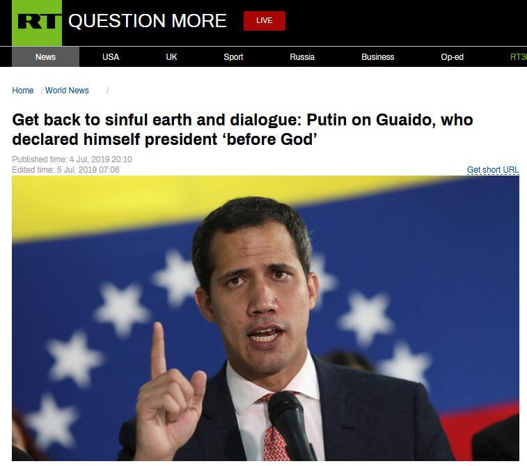 [环球网报道 记者 李东尧]“普京谈(委内瑞拉反对派领导人)瓜伊多,在上帝面前宣称自己是‘总统’:回到罪恶的地球,对话吧。”“今日俄罗斯”(RT)4日以此为题报道了普京当天在访问意大利时就委内瑞拉局势所作的一番表态。