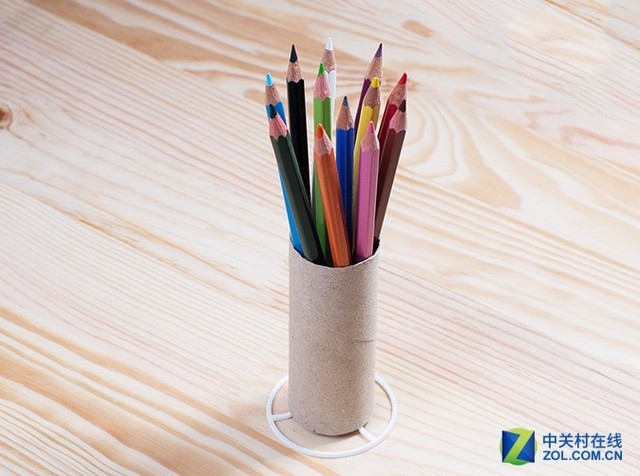 然后,一个简易的笔筒就诞生了。相比普通的塑料笔筒,纸制的笔筒看起来更有亲切感。而且,一旦笔筒脏了的话,也不用清洗,再更换一个新的卷筒即可。笔者认为,其实没有3D打印机打印底座也不要紧,完全可以使用细铁丝自己制作一个,也并不是件难事。