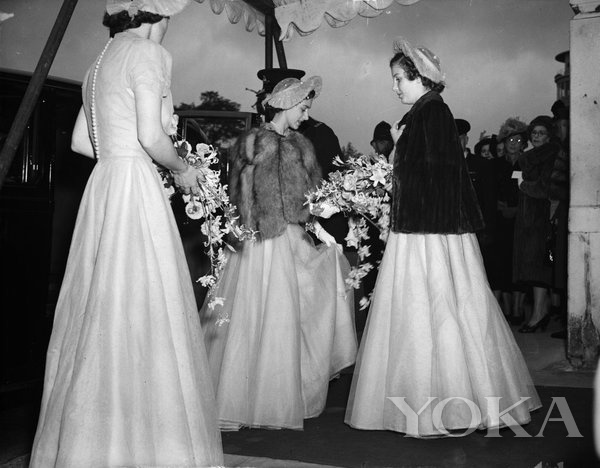 1948年,当伊丽莎白公主和玛格丽特公主的私人秘书约翰·科尔维尔结婚时,玛格丽特公主身穿薄纱礼服外搭皮草披肩亮相。