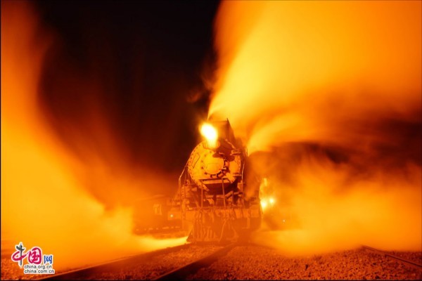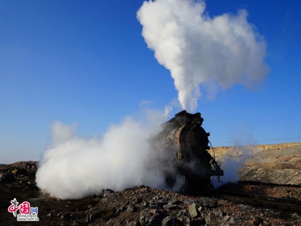 矿山、雪峰、夕阳下的矿野,伴着阵阵粗犷悠长的汽笛声,气势磅礴的蒸汽火车穿越白雪覆盖的新疆最大的露天煤矿----哈密地区三道岭煤矿蜿蜒而来。