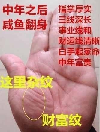 3:手上艮宫,大拇指的下方的杂纹又是另当别论,此处的杂纹一般都是属于富贵纹,说明此人勤劳踏实,不怕吃亏,不怕吃苦,年轻的时候往往对工作保佑很大的热情,积极进取,付出了最大的努力,因此,往往能够在中年大转之年获得咸鱼翻身的机会,中年一过,必定富贵逐渐到来,有希望富甲一