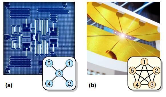 两种量子计算机分别来自门罗团队和IBM公司,都有5个量子位,但门罗团队用电磁场捕获的5个镱(Yb)离子创建,IBM公司是用超导性金属形成的5个环创建。
