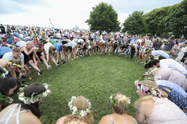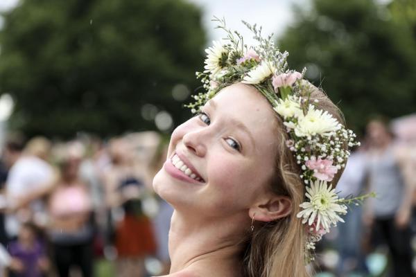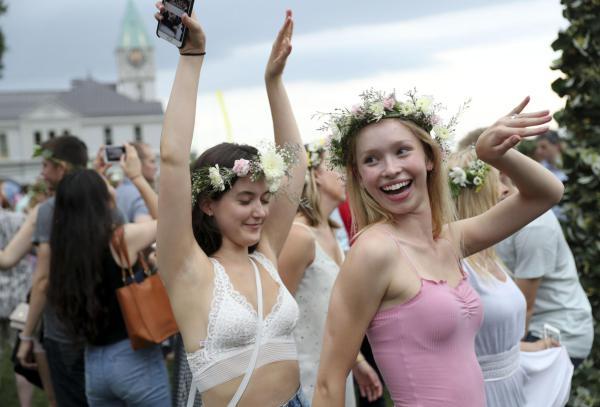 在美国纽约曼哈顿,一名女孩头戴花环参加瑞典仲夏节庆祝活动。在美国纽约曼哈顿,人们在瑞典仲夏节庆祝活动上领取制作花环的花束。在美国纽约曼哈顿,女孩们头戴花环参加瑞典仲夏节庆祝活动。在美国纽约曼哈顿,人们在瑞典仲夏节庆祝活动上围着花柱载歌载舞。