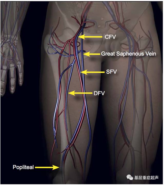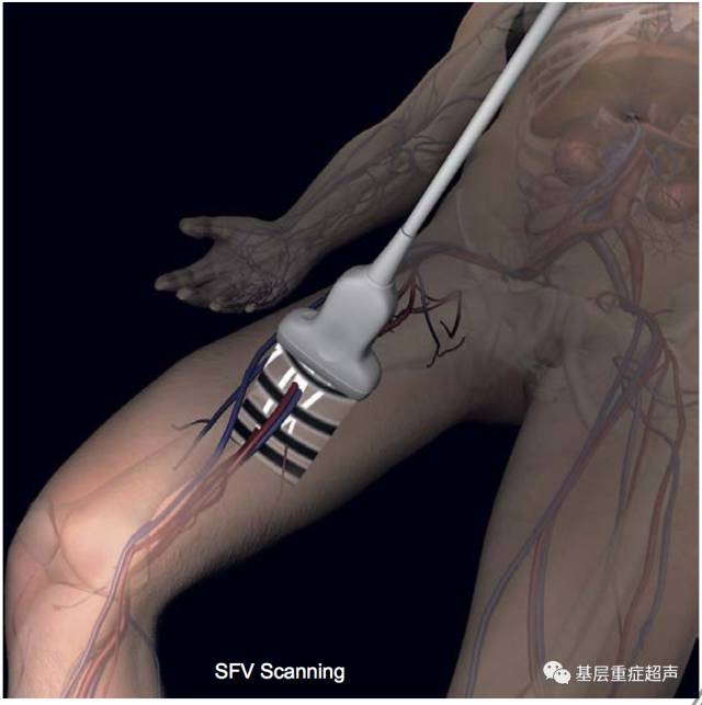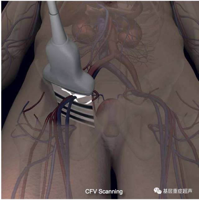 使用7~13MHz线阵探头,根据患者体质,调节深度在5~10cm。主要检查和评估湍流最大的区域以及形成血栓风险最大的部位:股总静脉、股深静脉近端和股浅静脉、腘静脉。CFV,股总静脉;Great Saphenous Vein,大隐静脉;SFV,股浅静脉;DFV,股深静脉;Popliteal,腘静脉