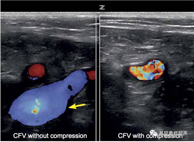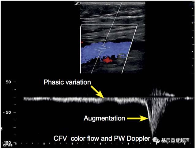 压迫小腿肌肉可以在超声图像上观察到近端静脉更加充盈。可用脉冲多普勒或彩色多普勒更好的观察静脉充盈,超声观察到静脉充盈,能够说明从远端的压迫部位至探头位置的静脉是通畅的。注意观察随着呼吸的静脉血流时相变化(吸气时收缩,呼气时扩张)。