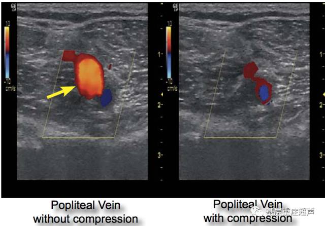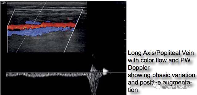 在腘窝处横向放置探头,可观察到与腘动脉及腘静脉。在彩色多普勒模式下,通过压迫腓肠肌促进回流,观察腘窝充盈。彩色多普勒可观察到随呼吸的时相变化