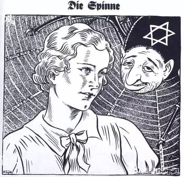 德国的反犹太宣传画:大鼻子的犹太人被描述成躲在阴暗角落的蜘蛛,觊觎金发碧眼的德国女郎,吸吮德国的财富。