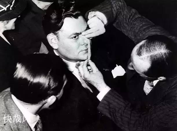 为了区分所谓优秀人种和劣等人种,纳粹专门研究编制了各人种特征的册子,比如雅利安人基本是身材高大、金发碧眼,犹太人则基本黑发、棕发,黑眼珠,鼻子大,等等。图为纳粹对身份不明者进行鼻子尺寸鉴定。