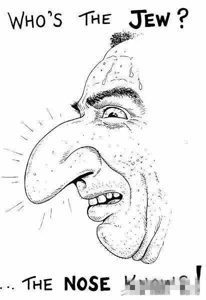 这张图一目了然:看鼻子!大多数犹太人的鼻子比较大,鼻梁略带弧形,两边鼻翼厚,鼻头成下垂状,被称为"犹太鼻"。纳粹认为这种鼻子是贪婪、自私、会赚钱的犹太人标志。