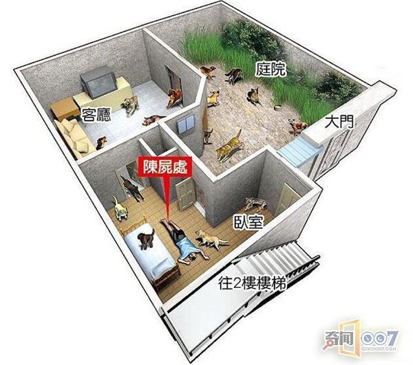 警方指出,该处2楼是彭男侄女夫妇的住处,侄女怕被叔叔的流浪狗咬伤,很少去1楼叔叔住处,平常都由屋外铁梯回2楼住家,叔侄间几无走动,侄女还是父亲来探视叔叔时,才知道叔叔死亡多时。警方分析,可能因庭院常发出恶臭,掩盖了尸体臭味,才未早日发现。