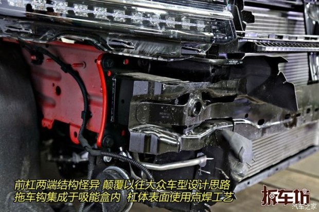 和常见的大众车型前防撞梁有所不同,途观L的并非标准的弓形结构。杠体中央局部呈现镂空状态,整个杠体的造型并不规则,而两端的设计更加特殊。拖车钩被焊接在前杠上,并连接后面的纵梁。位于杠体上方的塑料结构,是前杠皮的支撑架,并无吸能作用。