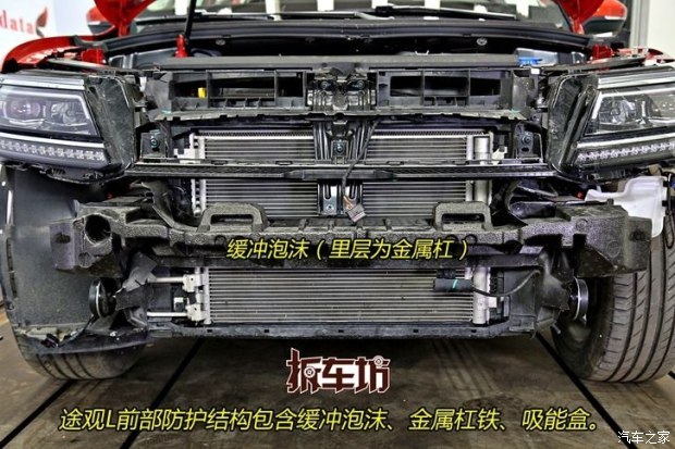 上汽大众途观L的意义也比较特别,"L"的含义不言而喻,上汽大众对其进行了加长处理,更符合国人用车的诉求。前部防护结构方面,和进口Tiguan相比,国产的途观L缺少了行人腿部防撞梁。缓冲泡沫、金属杠铁、吸能盒都算是标配,途观L做得都比较让人满意。取下泡沫缓冲材料后,可以看到金属杠铁。