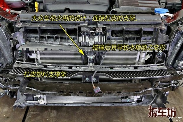 此前我们见过很多车在前杠上方设计金属支架,目的是支撑前杠皮,并非什么加强组件。但是这种结构会带来一定的负面效果,就是发生轻度碰撞时,本来水箱框架没什么事,结果因为这个支架,弄的大家一起变形,增加维修成本。没想到,途观L也出现了这样的结构,看来为了照顾到漂亮的外观,只能在内部结构上进行一定的牺牲了。