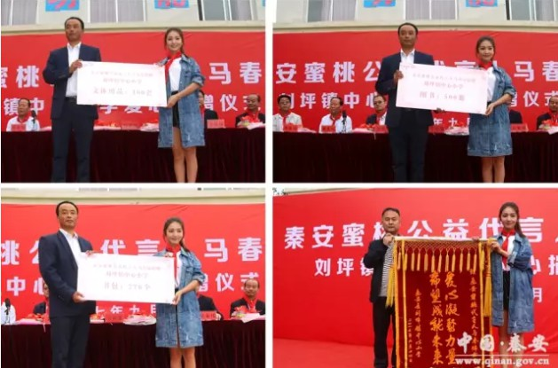 2017年9月13日,"秦安蜜桃"公益代言人马春瑞爱心捐赠仪式在刘坪镇中心小学举行,天水籍优秀青年演员马春瑞,县政府政府负责人,刘坪镇学区负责人、企业代表,刘坪镇中心小学全体师生参加了捐赠仪式。