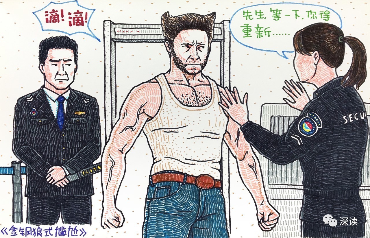 不仅是传统的《葫芦兄弟》《西游记》这些经典的卡通形象,杜可也常改编美漫和日漫: 金刚狼在安检时遭遇尴尬;