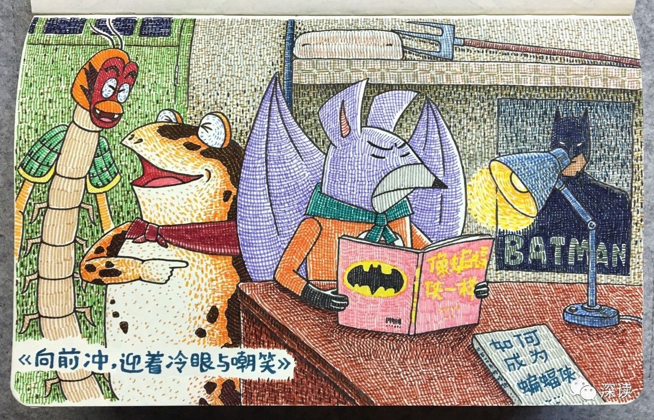 还有一则漫画里,《葫芦兄弟》中的小蝙蝠在认真研读《像蝙蝠侠一样》《如何成为蝙蝠侠》,背后还有美漫中蝙蝠侠的海报……