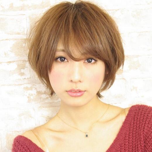 带有一丝凌乱感的女生短发造型,厚重的齐刘海,微蓬的发丝带着时尚的感觉,很不错哦。
