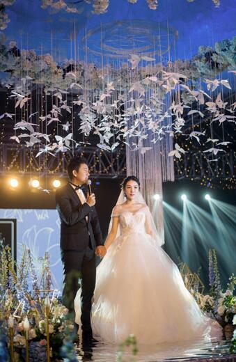 婚礼现场,宴会厅以音乐为灵感,铺满了蓝白相间的绣球花、风信子、铃兰草,浪漫与典雅使人身心愉悦。据了解,伍洲彤与刘冯合欢是因音乐而相识相知,伍洲彤也在婚礼现场大方的透露两人浪漫动人的恋爱故事并向妻子刘冯合欢立下誓言,场面极为感人。