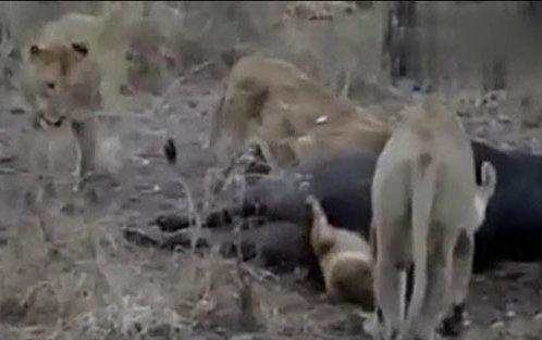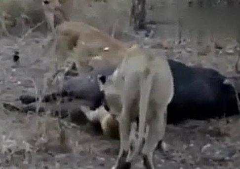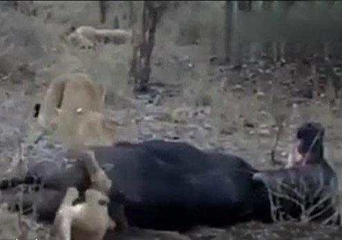 一只幼狮贪吃把头塞进野牛肛门里竟然被活活憋死。母狮子晃悠了一阵子之后,又回到了小狮子身边,但是依旧没看出来小狮子此刻的危险处境,以为这小狮子就是贪吃,在人家牛的肛门里面找别的好吃的。