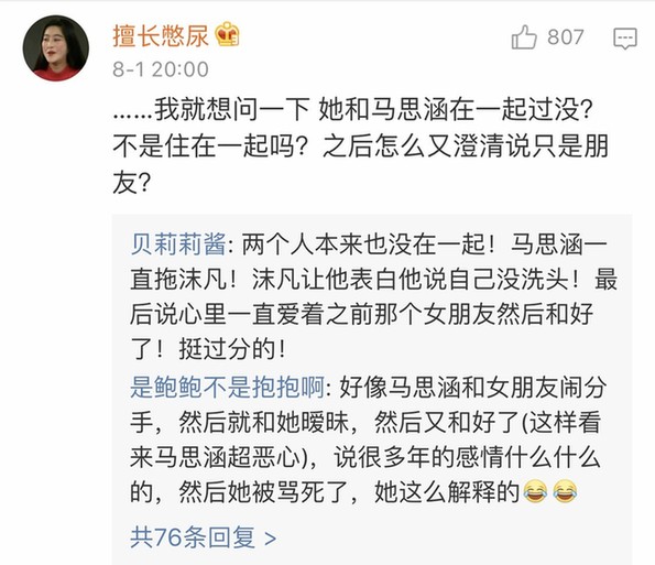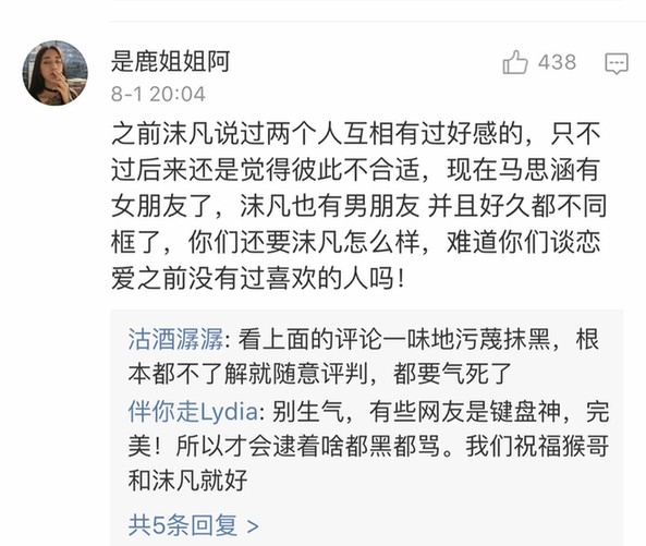 恋情一曝光,就引来了众多网友和粉丝们的围观,他们或发来贺电庆祝博主摆脱单身,或感叹金童玉女让自己"又相信爱情了",还有"入戏"很深的网友,去博主所谓前男友的微博下质问和声讨。" 张沫凡恋情"甚至一度登上微博热搜榜前几名的位置。
