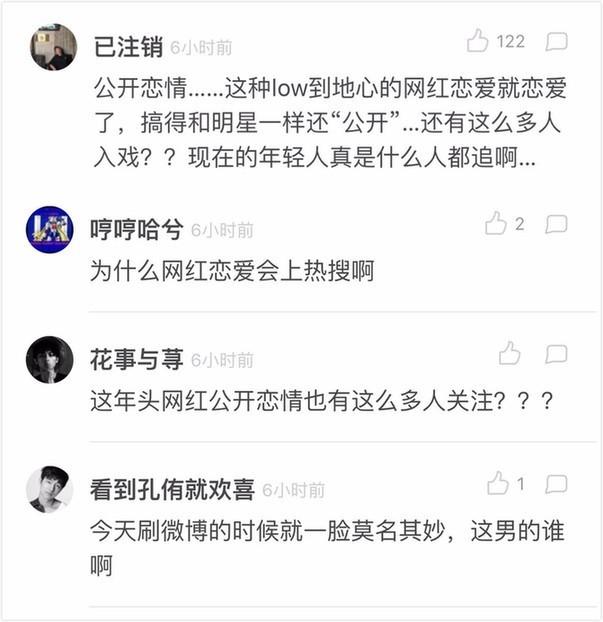 伴随着消息的不断传播和膨胀,质疑的声音也层出不穷。一些"吃瓜群众"表示一头雾水,自己根本不认识二位主人公,抱着满满的疑惑问道"为什么网红也能上热搜?"还有感叹"现在年轻人真是什么都追啊..."