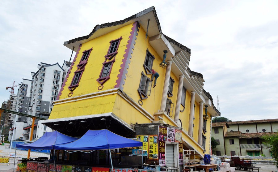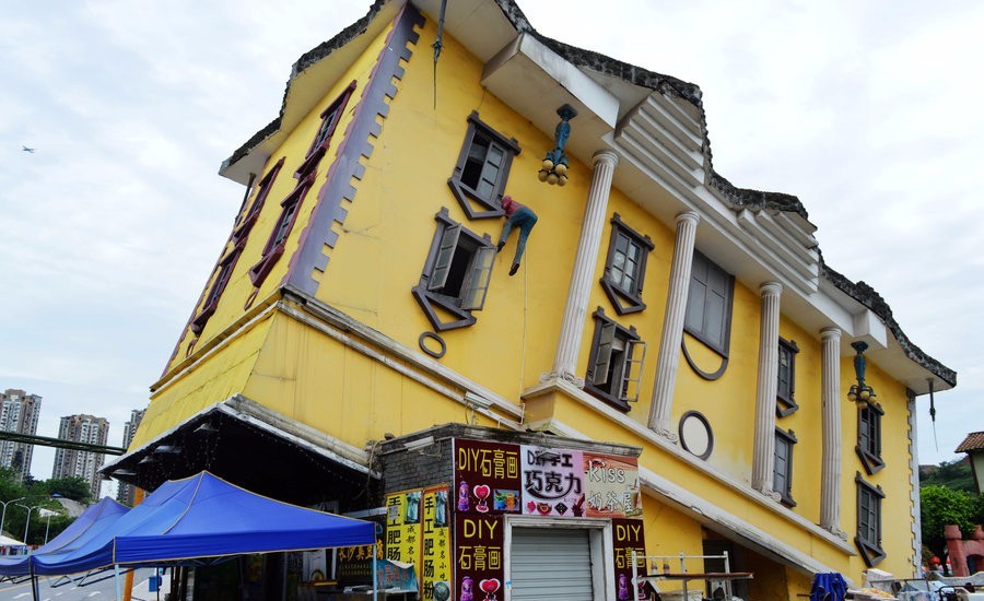 2017年5月25日,重庆,一座西式建筑风格的房屋上下翻转,令人惊叹。房子外观按照真实房屋比例与结构打造,外部门窗、路灯等陈设均系反转颠倒呈现,给市民带来强烈的视觉冲击,市民直呼:世界翻转了,厉害了! 仿佛随时要倒塌一般。