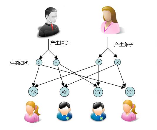 首先,我们来认识一下决定男性及女性的重要物质------染色体。染色体是遗传物质基因的载体,正常人染色体数目是23对,46条,其中22对为男女所共有,称为常染色体,另外一对为决定性别的染色体,称为性染色体,男性为XY,女性为XX,所以正常男性的染色体核型为46,XY,女性为46,XX。也就是说男性和女性最重要的差别就这条性染色体啦,那么在这里顺带讲一下一个正常的父母生男生女的遗传规律,请看下图:
