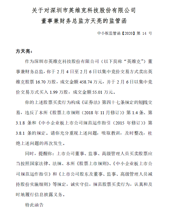 英维克两高管违规交易自家股票吃深交所监管函_北京时间
