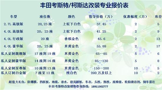 从外观的装饰上来说,我们可以根据丰田考斯特改装16座商务车的外观车型设计增加车身彩条,前格栅镀铬设计,前后丰田标志镀金设计,车轮毂罩,车身防爆膜,倒车影像等,改装的专业让每一辆丰田考斯特16座改装商务车在进入人们视线的那一刻都可以体现...