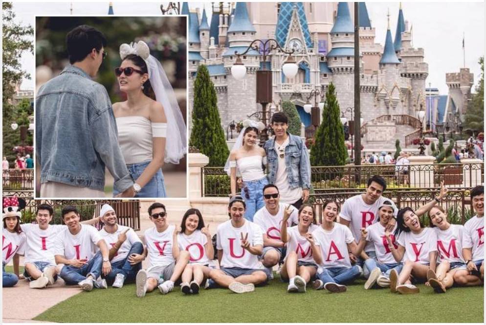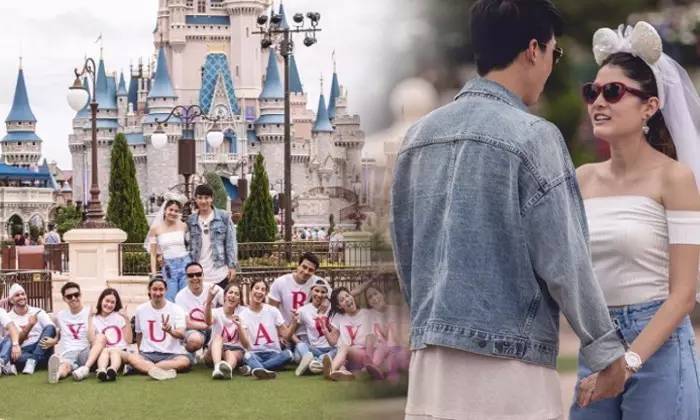 近日,Margie与Pok和朋友们一起去美国迪斯尼乐园游玩,Pok给了Margie一个出其不意的惊喜。通行的朋友们也都穿着字母T恤大力送上祝福。
