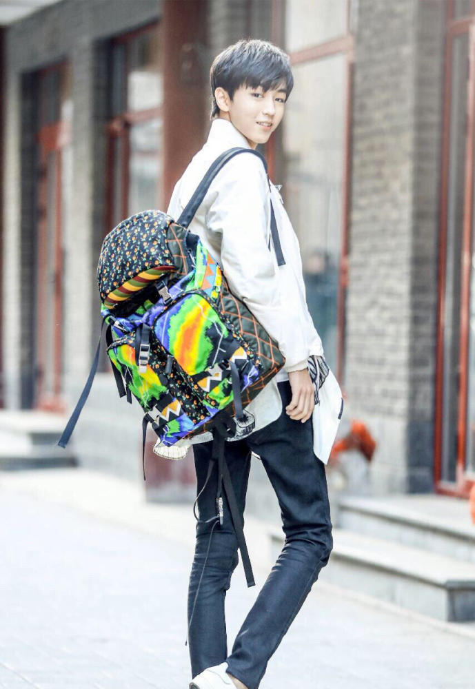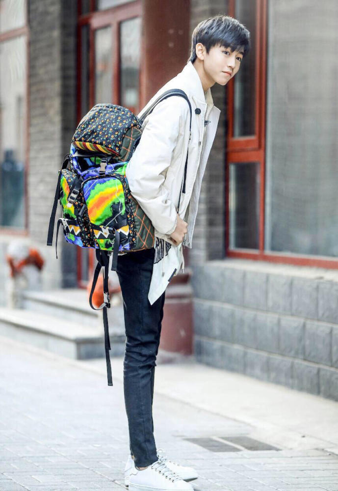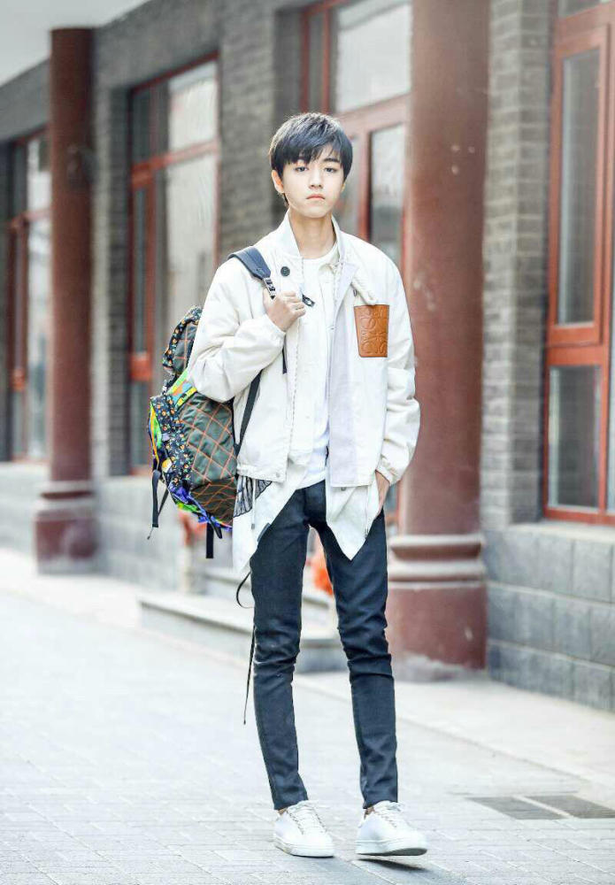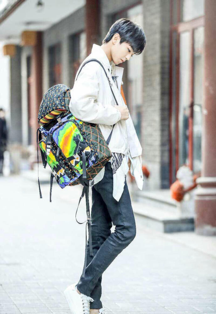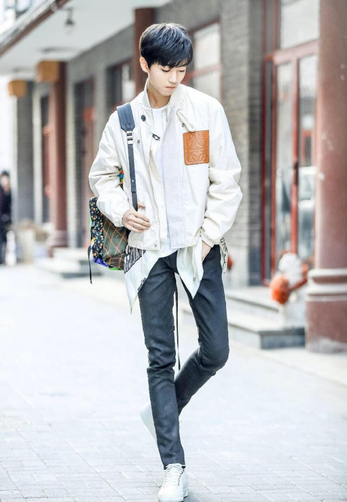 小凯身穿Loewe 2017春夏系列白色夹克,搭配修身仔裤及小白鞋。不规则下摆印花衬衫和肩上的Prada普拉达炫彩印花双肩包又是分外吸睛。外型阳光健康,气质清新干净,大长腿的优势更是突显百变的时尚感。