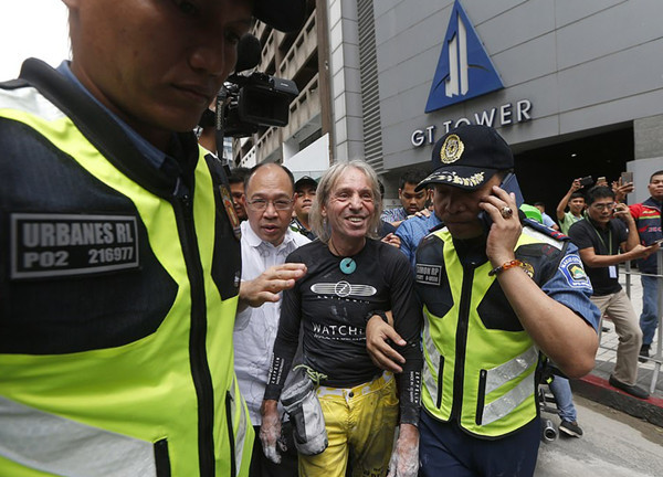 【环球网综合报道】据英国《每日邮报》1月29日报道,法国“蜘蛛人”亚伦•罗伯特在没有任何安全措施保护的前提下,徒手攀爬位于菲律宾首都马尼拉的47层高的GT国际大厦,落地后被警方逮捕。