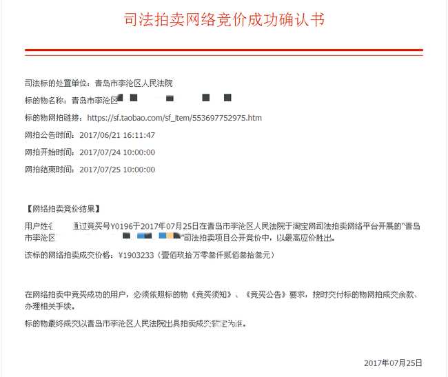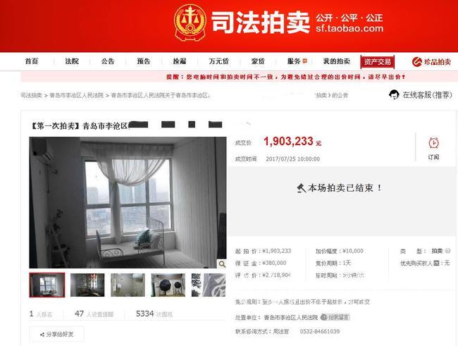 25日,李沧法院一套涉诉房屋以1903233元的价格在淘宝网上顺利成交,这是该院在网络司法拍卖工作启动以来成交的第一单。