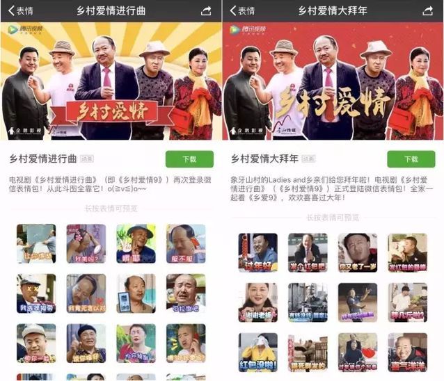 目前,微信精选表情中排在前列的影视剧表情专辑是企鹅影视制作的《乡村爱情进行曲》和《乡村爱情大拜年》,除此之外,企鹅影视还制作了《这才是鬼吹灯》、《如果蜗牛有爱情》《九州天空城》登表情专辑来宣传相应的电视剧,这些影视剧表情包延续了作品的话题讨论度,还可以利用微信的点对点传播开展周边产品的营销推广。