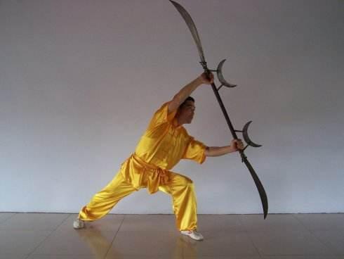 乾坤日月刀 乾坤日月刀是四门拳械具有代表的器械之一。全长约两米左右(可根据习练者本人的身高可长可短),它由两头相同的弧形刀和中段一对护手月牙组合而成,故又称护手双头刀。也有叫六合双头刀。