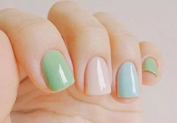 1.#跳色混搭(不同颜色)跳色美甲,搭配起来和谐又好看。不同的颜色,能够创造出不同的感觉和色感。柔和的灰+蓝,给人一种秋冬感,淡淡的甜美感瞬间提升起来。甜甜的黄+绿+蓝,青春的感觉迎面飘来。