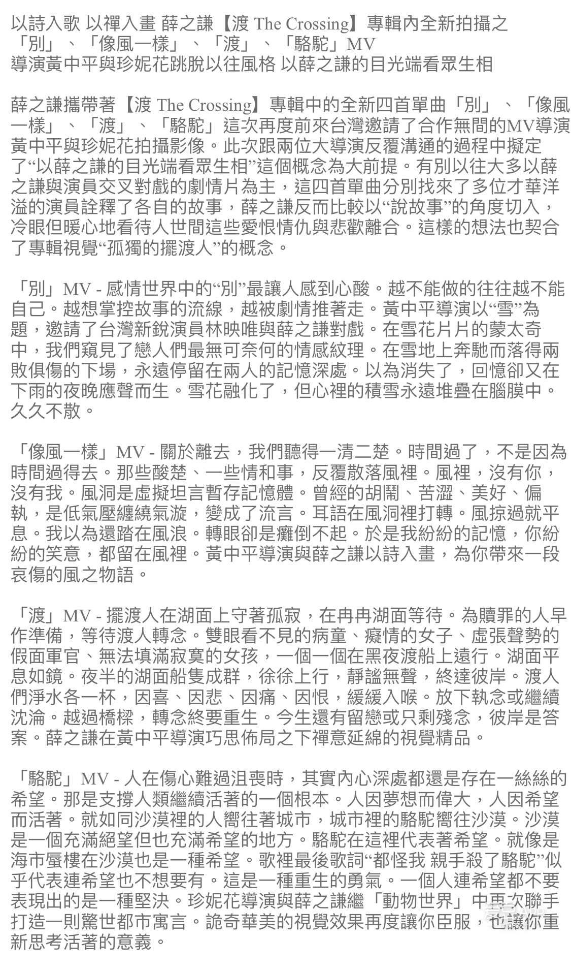爱豆新闻讯 薛之谦2017年新专辑《渡 The crossing》台版预售进行中,不仅惊喜出现的新的海报,专辑介绍中还有《别》《像风一样》《渡》《骆驼》四首新歌MV的大剧透,请开始你的脑补~
