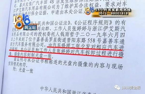 6月4号,钱先生所在公司请了嘉善县公证处公证,在嘉善车通四方汽车服务有限公司,由汽车修理工张师傅对汽车进行拆卸,公证员对拆卸过程进行拍摄,并刻录成光盘。来看公证员拍摄的,拆卸过程中的几个片段: