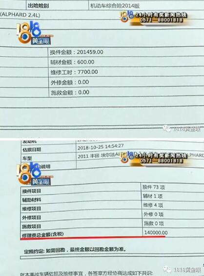 这辆被拆卸的丰田埃尔法,保的是太平洋财产保险,保险公司定损单上注明换件金额201459元,辅材金额600元,维修工时7700元,加起来是21万左右,其中导航接收器是54012元。