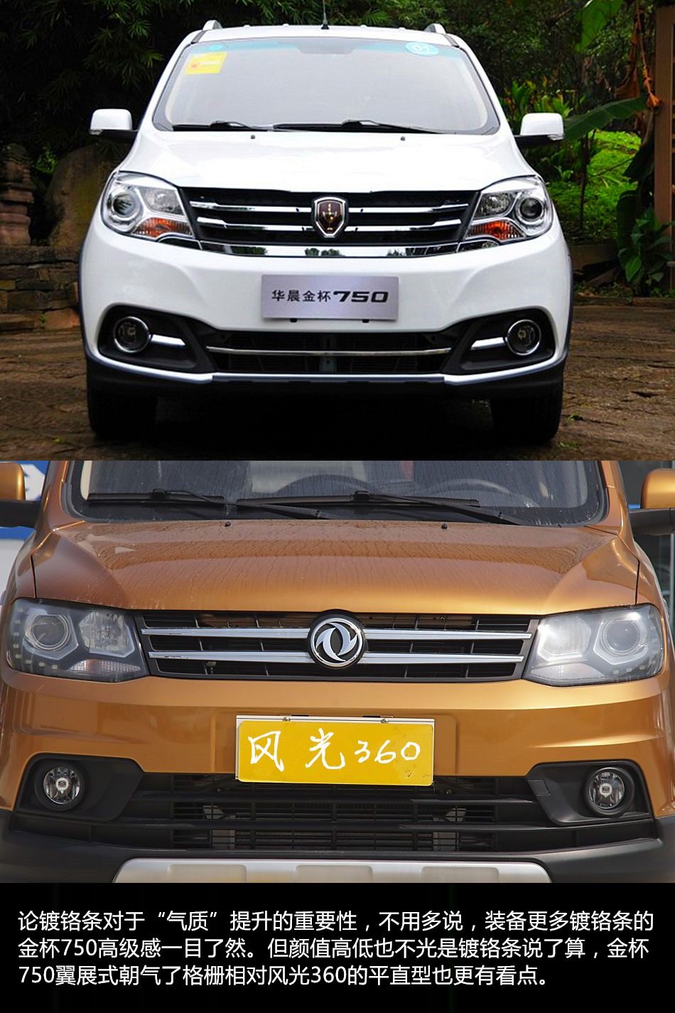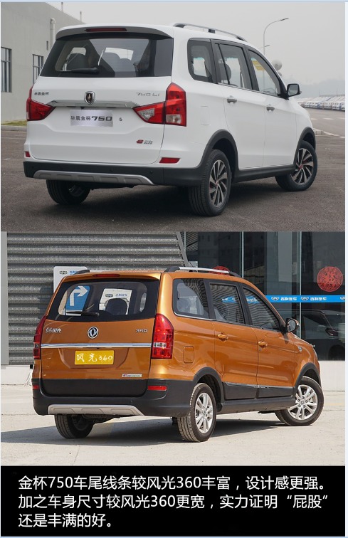 车系方面,金杯750这款车只有1.5L自然吸气一种排量,按照配置不同,售价从5.38万至7.33万不等。风光360则有1.5L自然吸气和1.3T涡轮增压两个排量两种发动机配置,售价区间在5.79万至7.49万之间。本次对比我们选择了华晨金杯750 2016款 1.5L e动型(以下简称金杯750)和东风风光360 2015款 1.3T 柴油 手动豪华型 7座(以下简称风光360)这两款在各自车系中关注度较高的车型来进行对比,而且它们的厂家指导价仅相差1600元。目前风光360无优惠,金杯750的"春季大促"优惠活动还在进行中,具体降价幅度请咨询当地4S店。