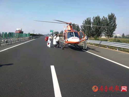 齐鲁晚报讯(记者 张泰来 通讯员 樊军)车流繁忙的高速公路上来了一架直升飞机。24日上午9点左右,荣潍高速公路潍坊段发生一起交通事故,一名伤者受伤严重继续救治。为了节约救援时间,潍坊高速交警协调直升飞机来了场垂直救援。
