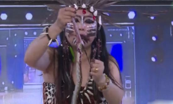 7月3日,重庆云阳一景区里,一名女子正在表演生吃活蛇,配着啤酒当下酒菜。