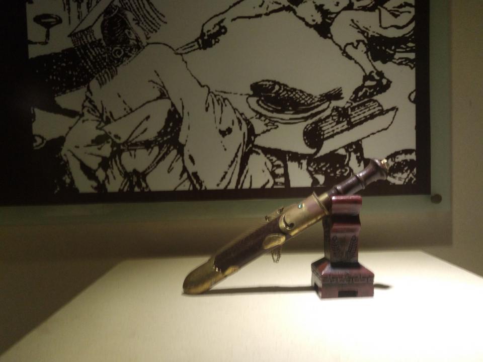 八、昆吾刀 昆吾乃用昆吾石冶炼成铁制作的刀。《山海经·中山经》:"伊水西二百里有昆吾之山,其上多赤铜。晋郭璞注:此山出名铜,色赤如火,以之做刃,切玉如割泥也。"传言割玉须用昆吾刀。