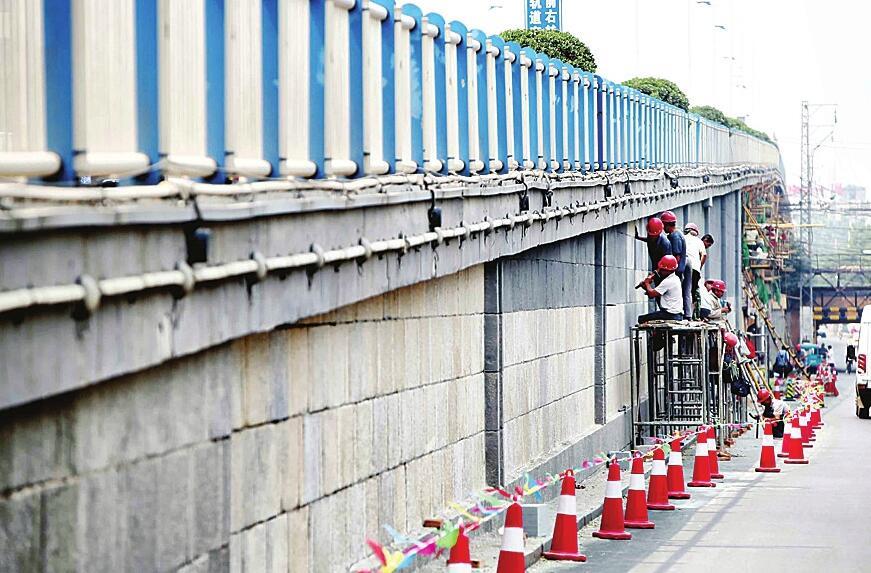 在已有百年历史的天桥东侧,施工人员正拿着铁锤将原有的灰色底漆清除,擦掉岁月留下的痕迹,恢复旧日原貌。目前,作为全市的标志性建筑,天桥上下正进行整体修缮,以恢复其老本色,变身城市中一道特色街景。