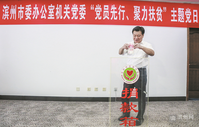 活动当天,党员首先观看了主题为"慈惠你我·善行滨州"的滨州市慈善总会工作纪实片,了解慈善工作的开展情况,并学习市委、市政府印发的《关于开展2017年滨州市慈善扶贫募捐活动的通知》。随后,现场进行慈善捐款,市委书记、市人大常委会主任张光峰,市委副书记、市长崔洪刚等领导带头募捐,每名党员也踊跃捐款、奉献爱心,并于捐款结束后领取了市慈善总会发放的捐赠证书。