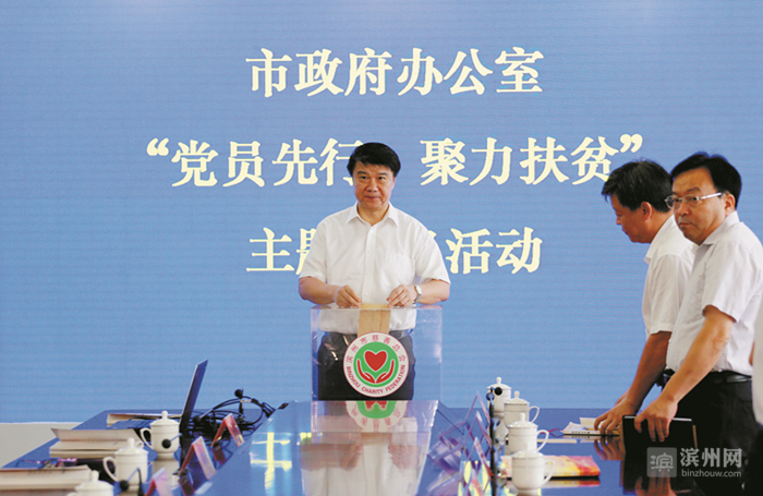 又讯 9月5日,市政府办公室开展了"党员先行 聚力扶贫"主题党日活动。活动中,市委副书记、市长崔洪刚带头捐款。市政府办公室党员干部纷纷解囊助力,共捐助善款万余元,以实际行动为全市扶贫和慈善工作作贡献。